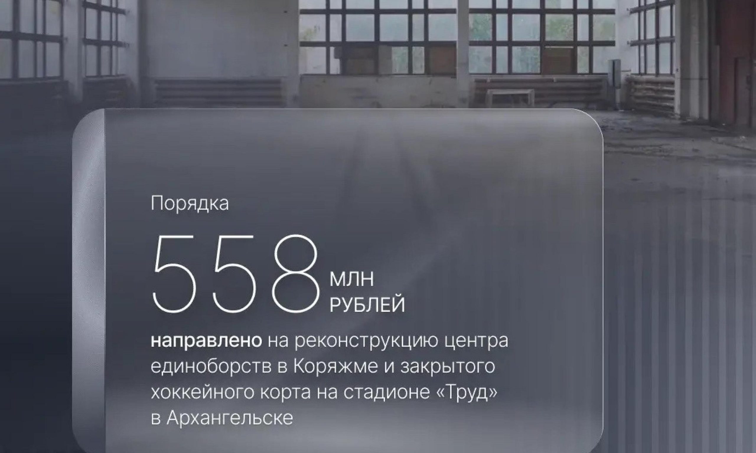 В регионе начнётся обновление центра единоборств в Коряжме и крытого хоккейного корта на стадионе «Труд» в Архангельске. Оба проекта получили поддержку из федерального бюджета, общий объем финансирования составит около